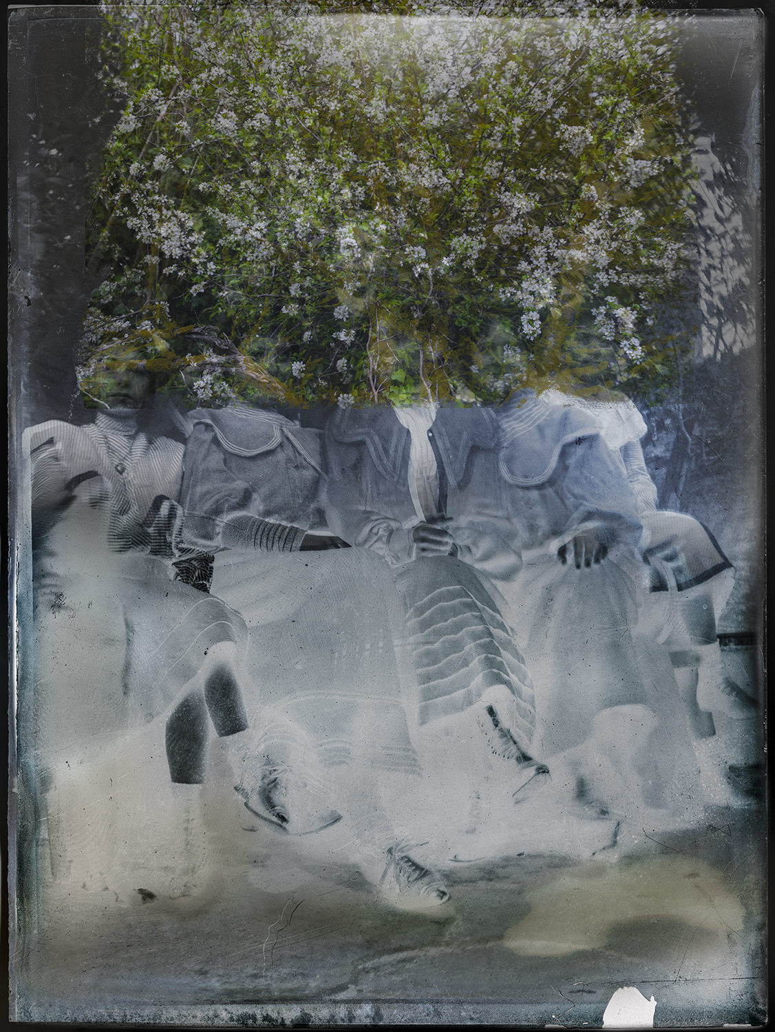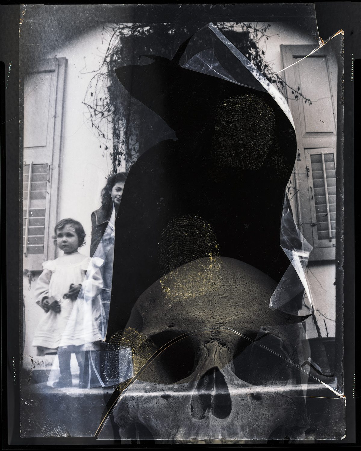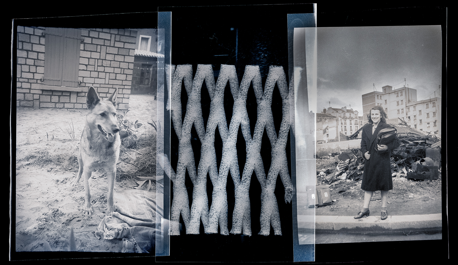 Pour ce faire j’utilise d’une part les photographies réalisées sur plaque de verre et sur anciens négatifs par des membres de ma famille entre 1910 et 1940, et compose de nouvelles images comportant certains de mes photographies produites au fil du temps, ainsi que des objets tridimensionnels que j’enregistre avec un scanner. Par ce processus je conserve et met au jour le lien entre les époques et les éléments.